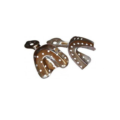 Ложка слепочная металлическая крупноперфорированная от производителя ММИЗ — для изготовления временных назубных капп и шин из самотвердеющих пластмасс, силиконовых и альгинатных оттискных масс.