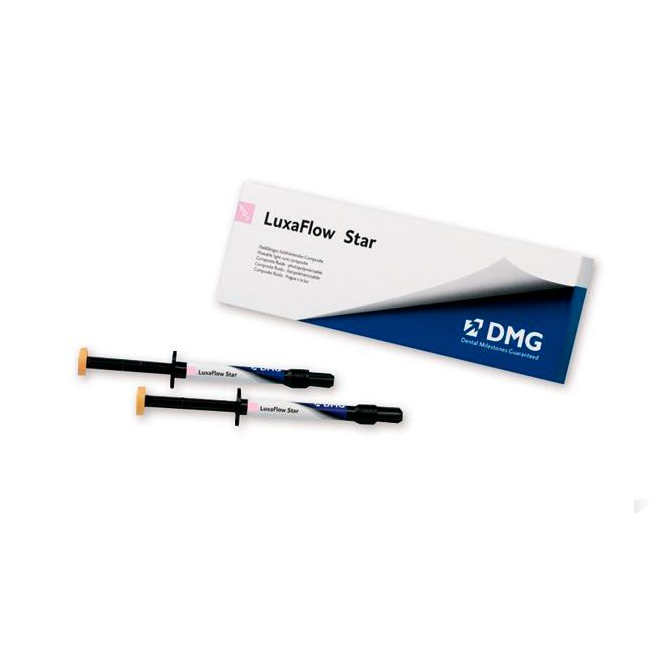 LuxaFlow Star от производителя DMG — cветоотверждаемый текучий композит для реставраций и надстройки временных конструкций, пломбирование небольших полостей III, IV и V классов, минимально инвазивные реставрации.