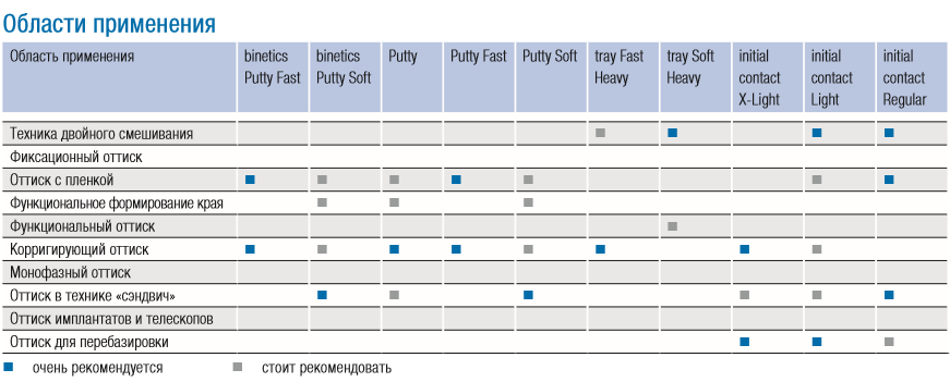 - Для каждой комбинации и техники выполнения оттиска подходящий корригирующий материал среднетекучий, жидкотекучий или очень жидкотекучий; нормального или быстрого схватывания;
