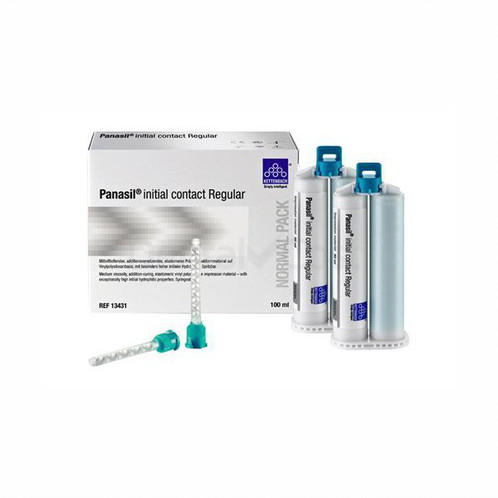 Panasil initial contact от производителя Kettenbach – аддитивный, эластомерный, прецизионный оттискный материал на основе винилполисилоксана с особенно высокой изначальной гидрофильностью. Очень жидкотекучий X-Light, жидкотекучий Light и среднетекучий Regular, соответственно с нормальным и быстрым схватыванием (Fast set). Идеален в комбинации с материалами первого слоя Panasil для корригирующей техники оттиска, техники «сэндвич» и техники двойного смешивания.