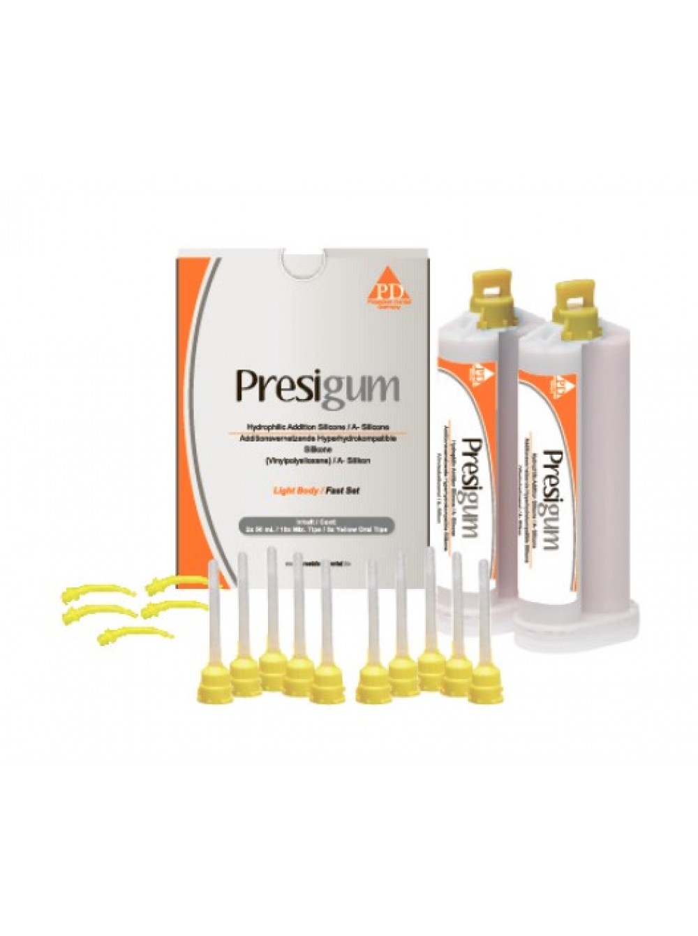 Presigum А-силикон - слепочный материал высокого качества гарантирует большую точность отображения. Винилполисилоксановый оттискной материал прост в использовании и гарантирует точность воспроизведения поддесневых областей. Оттискная масса имеет отличные гидрофильные свойства, размерную стабильность, восстанавливается после деформации, легко извлекается из полости рта, воспроизводит мельчайшие детали. Применяется для различных техник снятия оттисков в любых клинических ситуациях.