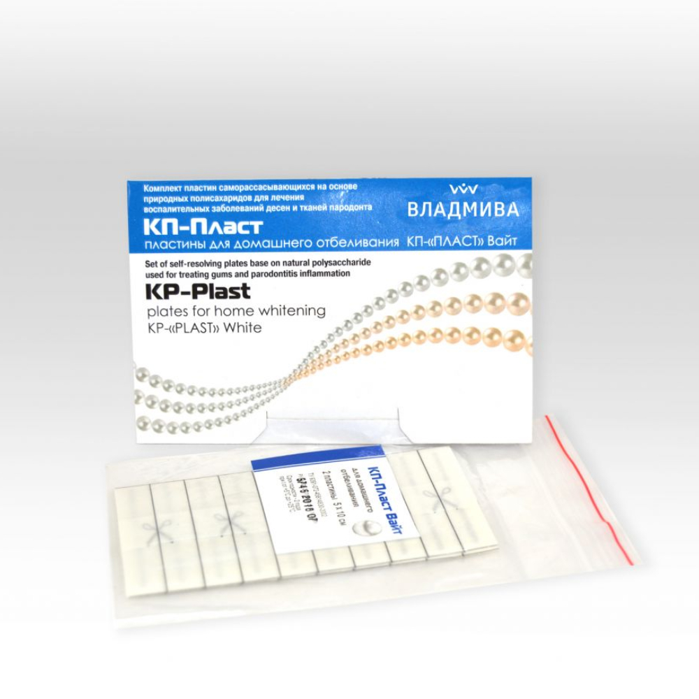 КП-ПЛАСТ Вайт от производителя Владмива — двухслойные самоклеящиеся пластины предназначены для отбеливания зубов в домашних условиях и сохранения белого цвета зубов после процедуры клинического отбеливания.