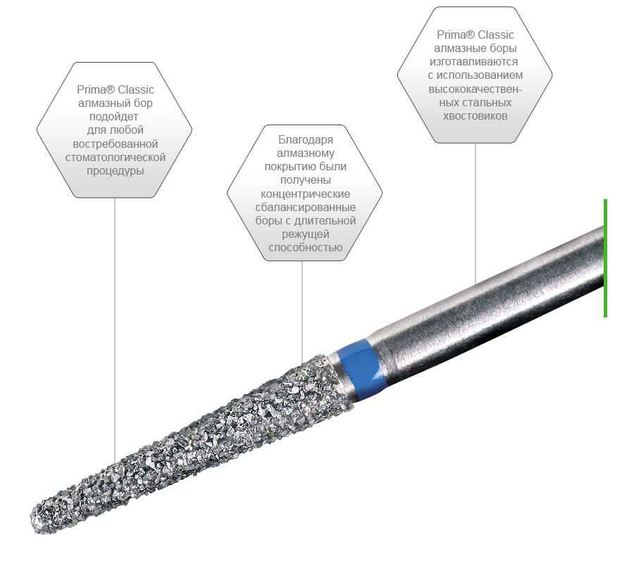 Стержень (хвостовик) алмазного бора Prima Dental Group производится из нержавеющей стали марки 416521 или 303531, головка гальванически покрыта никелем для инкапсуляции крошки из натурального алмаза. Общая толщина слоя никеля и алмазной крошки составляет 0,3 мм.