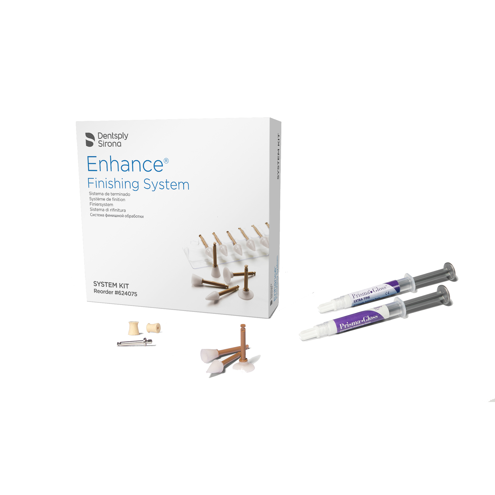Enhance® Composite Finishing & Polishing System от производителя Dentsply Sirona — система для полировки и финишной обработки композитных материалов, используемых во фронтальной и жевательной группах зубов, и для применения в любых других случаях, требующих финишной обработки.