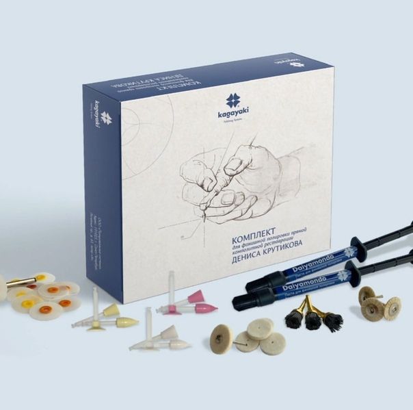 Набор Крутикова от производителя Kagayaki — комплект для финишной полировки Крутикова: паста стоматологическая шлифовальная "Kagayaki Daiyamodo" 4 г., полир "Kagayaki Enforce Pin", полир Диск шлифовальный "Kagayaki RoundFlex".