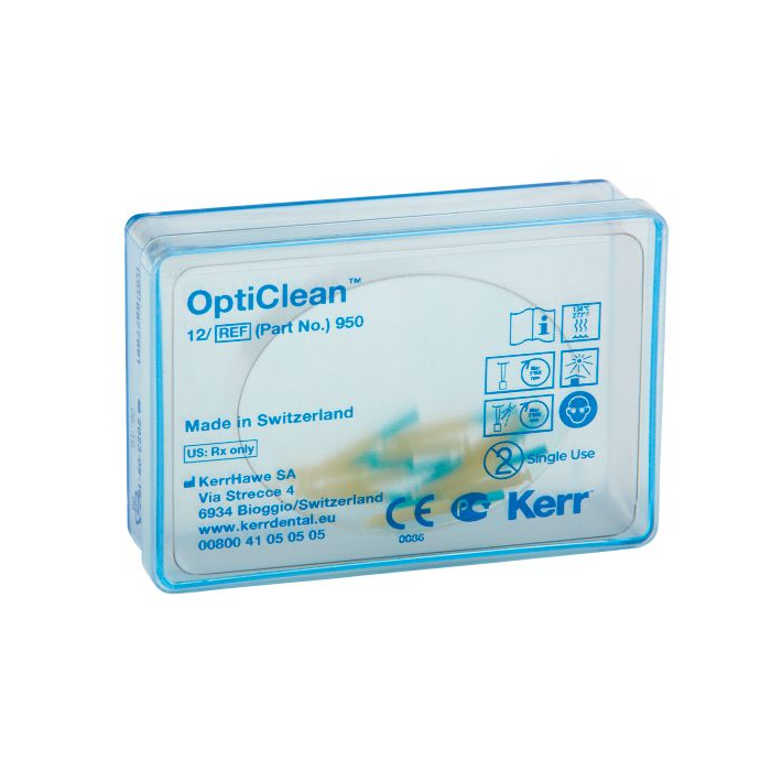 OptiClean №950 от производителя Kerr — полир для удаления временного цемента и очищения культи зуба с эластичным покрытием и диаметром 1,65 мм. Усовершенствованная абразивная технология позволяет эффективно удалять временный цемент с минимальным риском сошлифовывания дентина.
