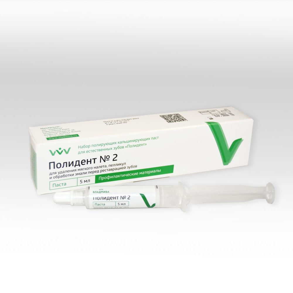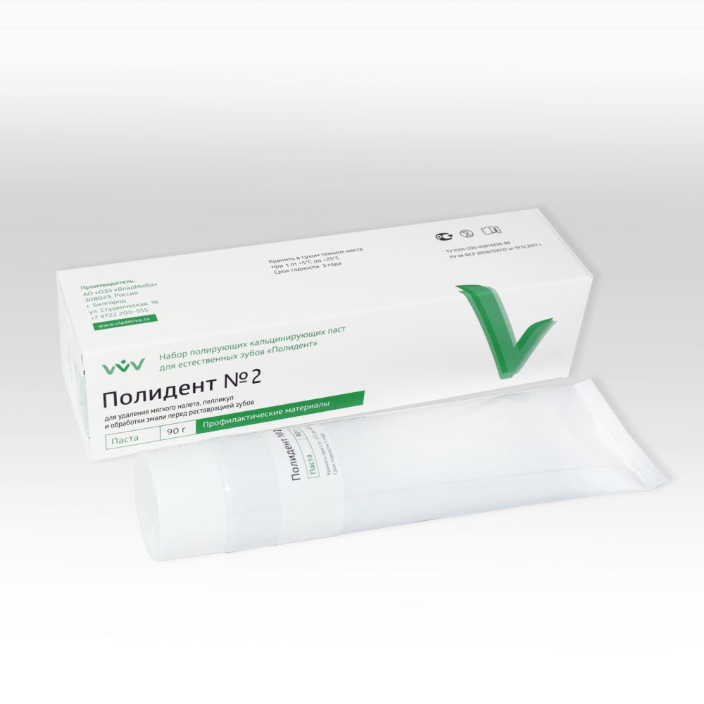 Полидент №2 от производителя Владмива – паста для удаления мягкого налета, пелликул и обработки эмали перед реставрацией зубов, герметизацией фиссур, отбеливанием зубов, а также для профилактики кариеса методом снятия зубных отложений.