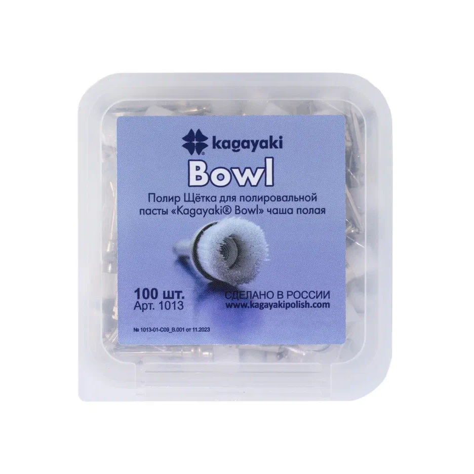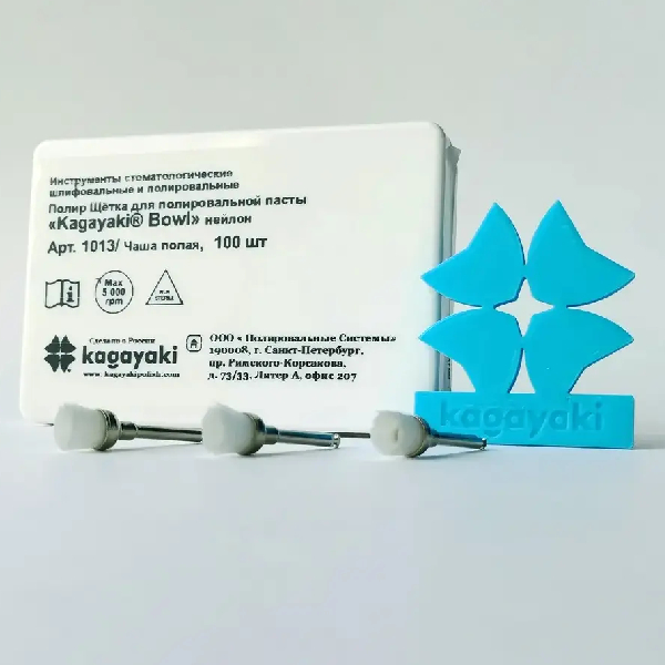 Полир щетка Kagayaki Bowl от производителя Kagayaki — полировальная щетка на угловой наконечник, применяются для удаления мягких и твёрдых зубных отложений с внешней и внутренней поверхности зубов, для быстрой зеркальной полировки окклюзионных и вогнутых поверхностей реставраций из композитов, компомеров, стеклоиономеров и керамики, а также для профилактической обработки в целях обеспечения профессиональной гигиены полости рта. Щеточки предназначены для использования с абразивными пастами марки Kagayaki.