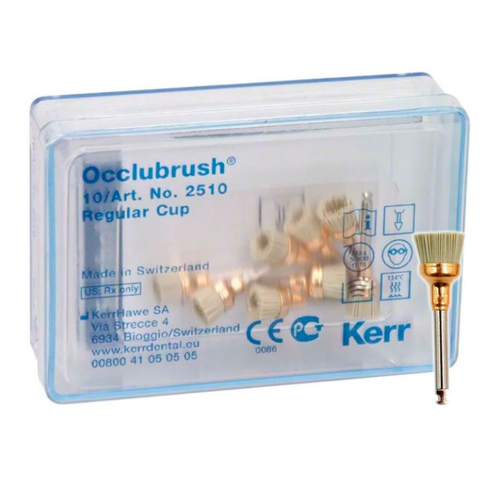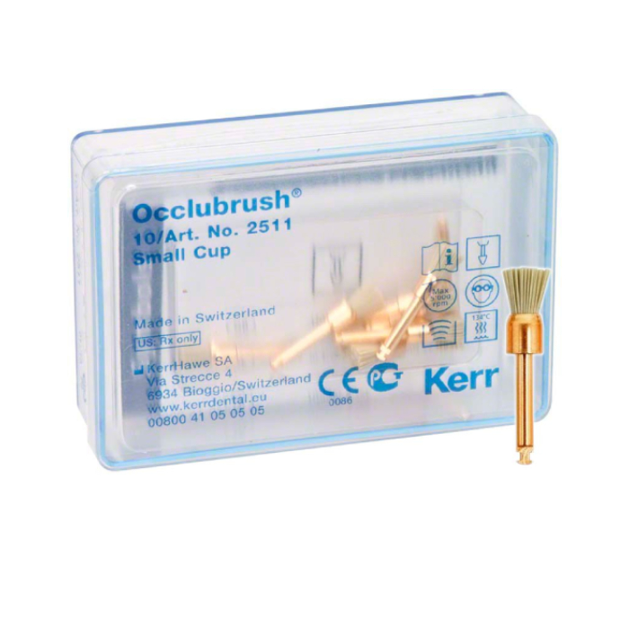 Щетки Occlubrush от производителя Kerr — используются для быстрой зеркальной полировки окклюзионных и вогнутых поверхностей реставраций из композитов, компомеров, стеклоиономеров и керамики, а также для профилактической обработки.