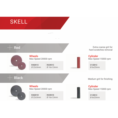 Полир на основе резины, абразив - карбид кремния. Широко используются в стоматологической области, особенно для работы с хромовыми / кобальтовыми сплавами, и в ювелирной области, чтобы работать особенно с драгоценными сплавами, серебром и золотом. Эти абразивы предлагаются для различных применений: от жесткого удаления царапин до высокого блеска.