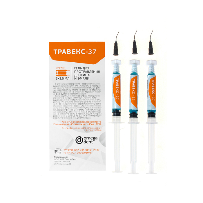 Травекс-37 от производителя Омега-Дент — гель для травления эмали и дентина с оптимальным содержанием фосфорной кислоты высшей квалификации - 37%.