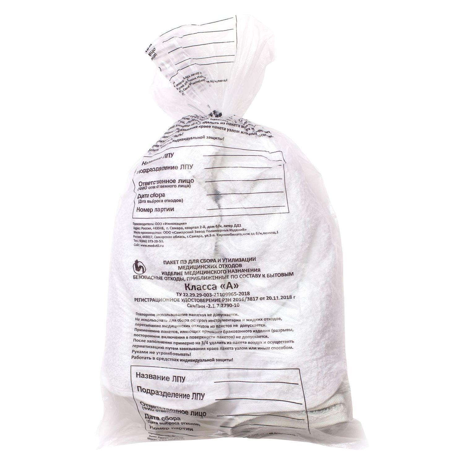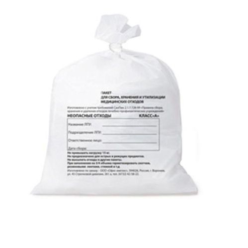Класс А (неопасные), белые пакеты — отходы, не имеющие контакта с биологическими жидкостями пациентов, инфекционными больными, нетоксичные отходы.