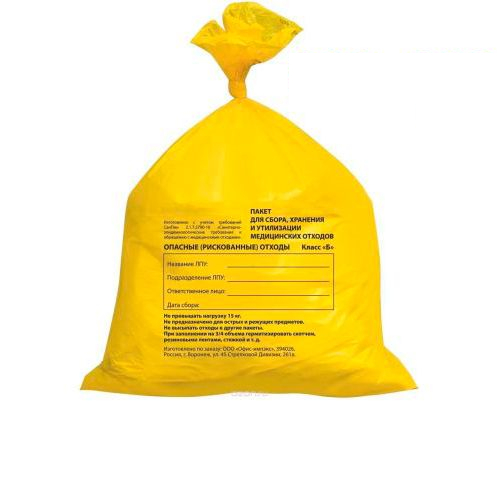 Класс Б (опасные, рискованные), желтые пакеты — потенциально-инфицированные отходы.