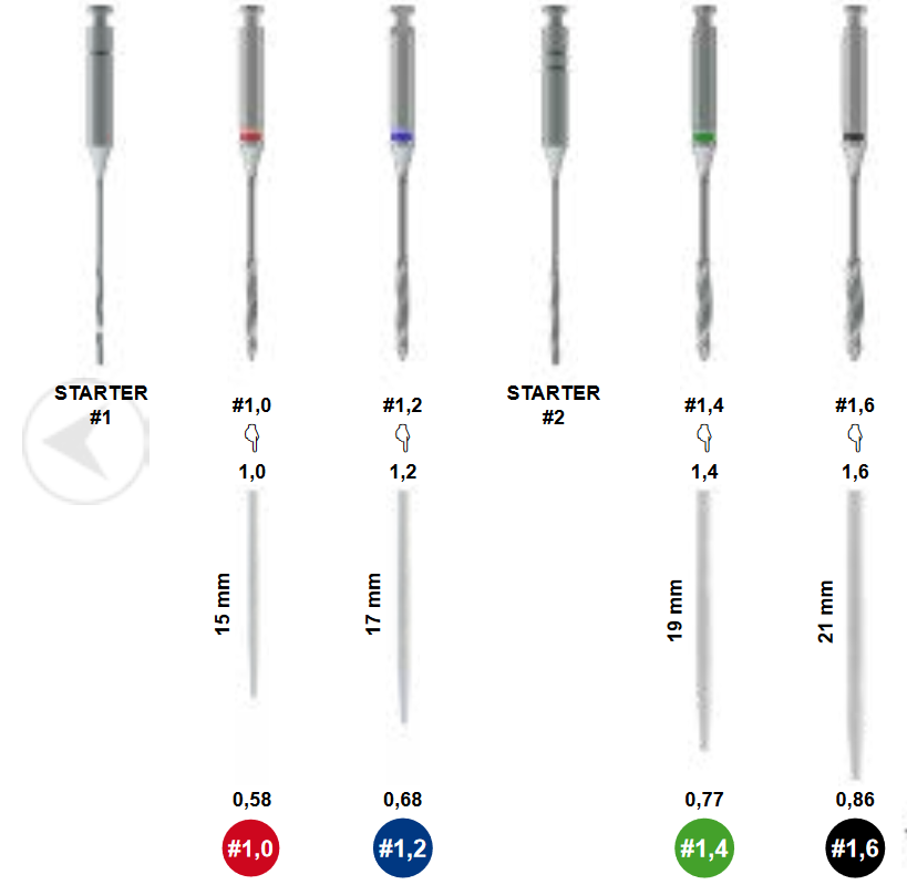 - Финишные дрили: Ø 1,02 мм, Ø 1,22 мм, Ø 1,42 мм, Ø 1,62 мм.