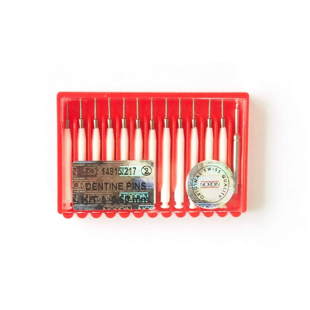 Парапульпарные штифты Нордин - это не просто проволока с резьбой и хвостовиком, а прочный стержень из чистого титана, обработанный машинным способом. Резьба нарезана со швейцарской часовой точностью, она легко ввинчивается в твердые ткани зуба, обеспечивая максимально надежное крепление. Каждый штифт снабжен хвостовиком, облегчающим вкручивание без нежелательной нагрузки на дентин.