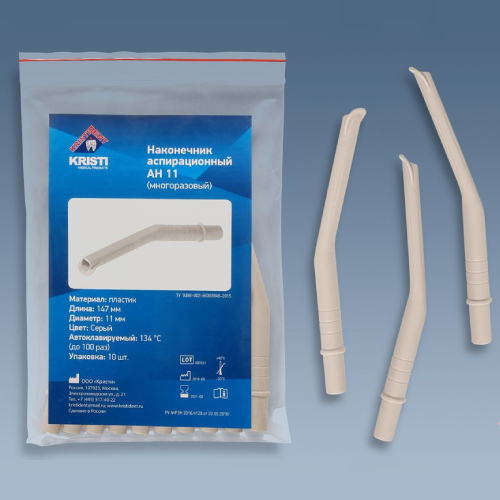 Пылесосы многоразовые АН 11 от производителя Кристидент - многоразовые пылесосы для всасывания (аспирации) из ротовой полости пациента аэрозолей и твердых частиц, находящихся во взвешенном состоянии в жидкости при проведении стоматологических процедур, с целью удаления ограниченного объема жидкости (слюны) и взвеси изо рта пациента. Предназначен для детей и взрослых (ø11 мм).