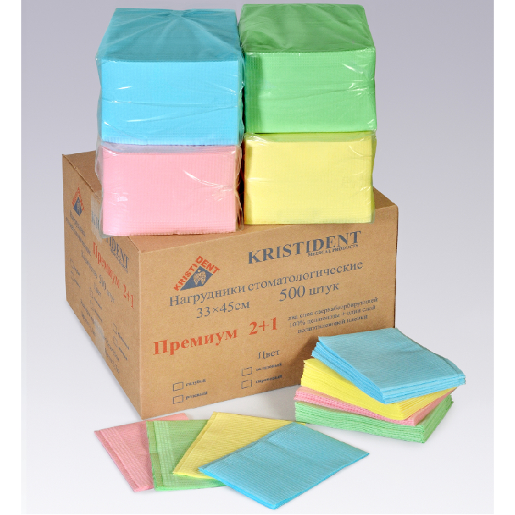 Нагрудные салфетки трехслойные Премиум от производителя Кристидент — нагрудники стоматологические, 3-х слойные, одноразовые, максимально защищают одежду пациента от загрязнения во время стоматологического лечения и сопутствующих процедур благодаря рельефному горизонтальному рисунку.