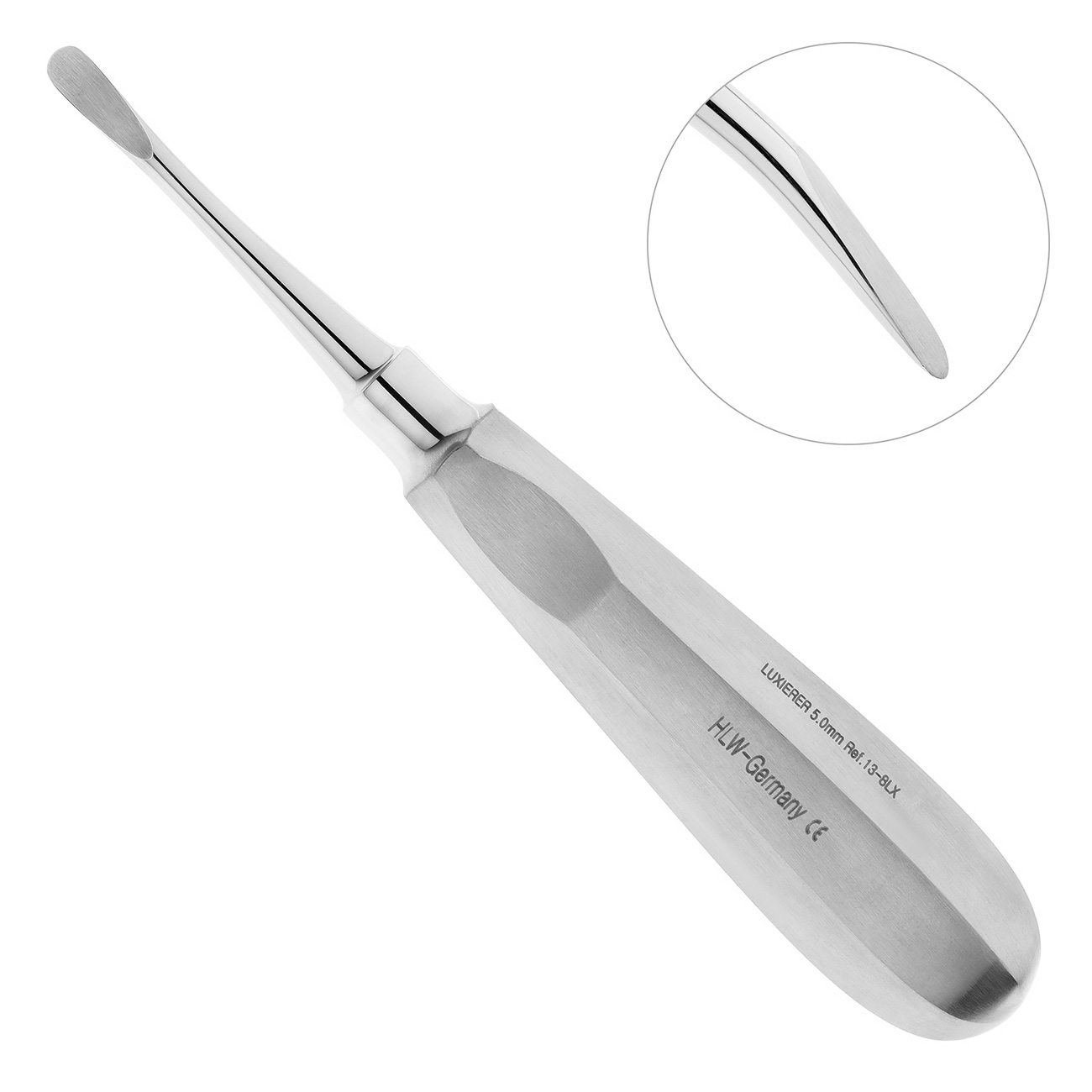 Люксаторы изогнутые, 5 мм от производителя HLW Dental с шириной рабочей части 5 мм предназначены для атравматичной экстракции корней и зубов на нижней и верхней челюсти.