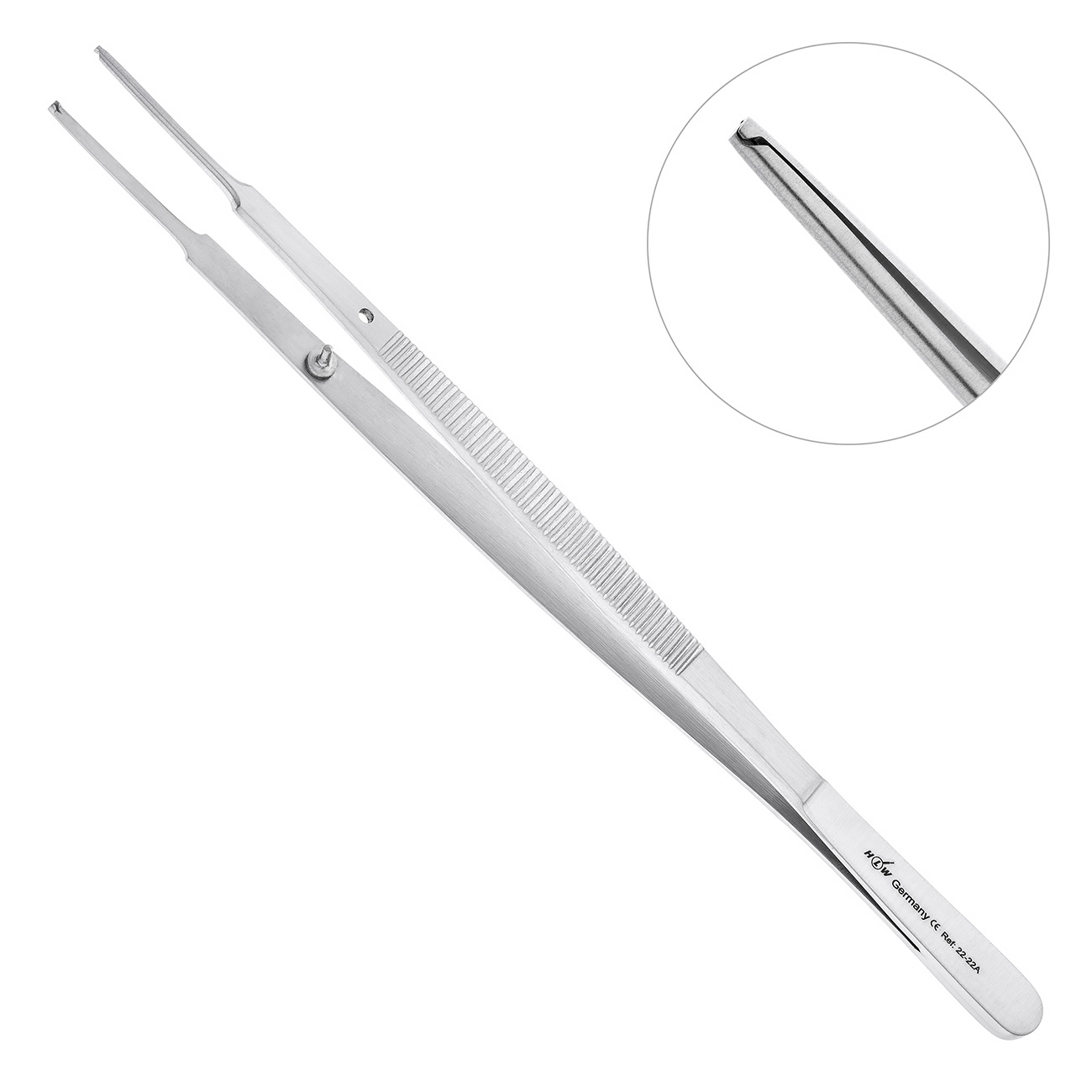 - Рабочие поверхности пинцета с внутренней стороны имеют продольные атравматические насечки для деликатного захвата и удерживания мягких тканей в ротовой полости. Изгиб по плоскости в рабочей части инструмента обеспечивает доступ в глубокие и труднодоступные участки полости рта.