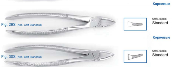 - 11-29S — для удаления корней молочных зубов на верхней челюсти. Рабочие части прямые, сходящиеся;