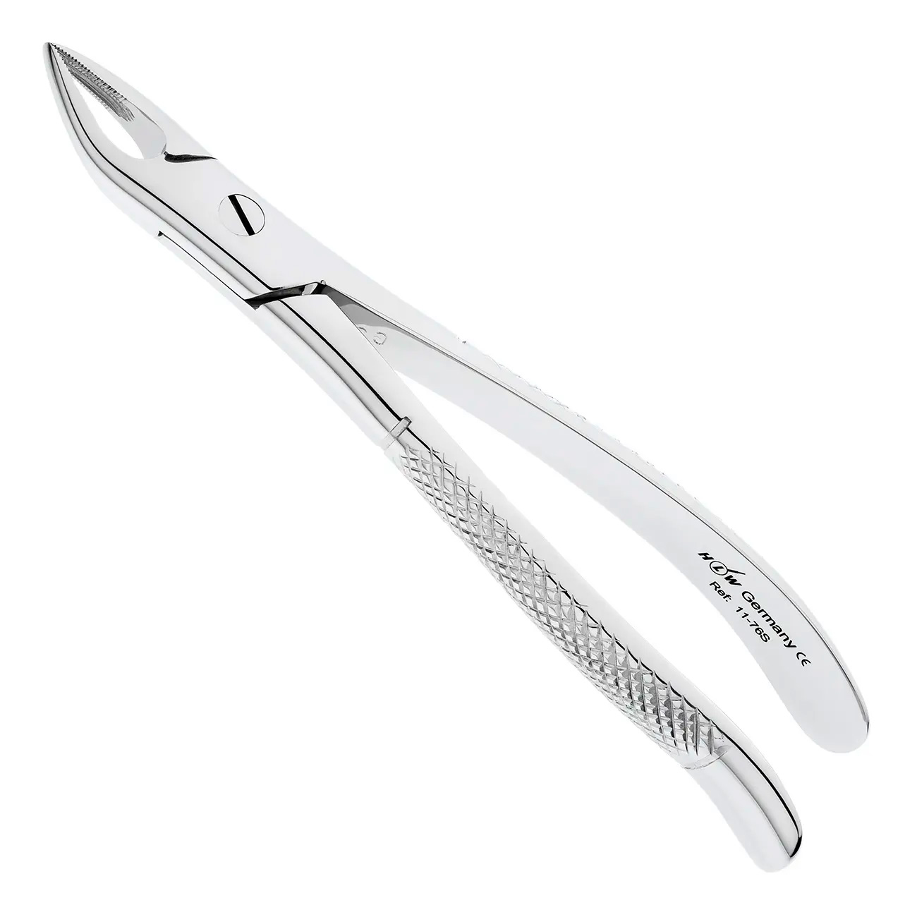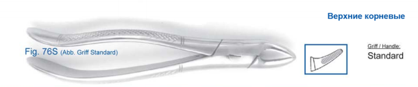 - 11-76S — для удаления корней молочных зубов на верхней челюсти. Рабочие части сходящиеся, закругленные на концах. Инструмент подходит для удаления корней зубов как с левой, так и с правой стороны.