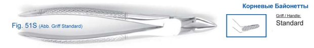 - 11-51S — для удаления корней молочных зубов на верхней челюсти. Рабочие части сходящиеся, с байонетным изгибом, позволяющим добраться для труднодоступных участков;