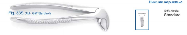 - 11-33S — для удаления корней молочных зубов на нижней челюсти. Рабочие поверхности узкие, закругленные на концах и несходящиеся при смыкании. Щечки клювовидных щипцов расположены под углом 90° относительно продольной оси инструмента;