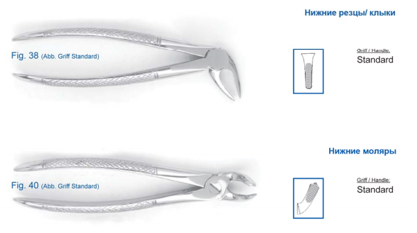 - 11-38 — для удаления молочных зубов фронтальной группы на нижней челюсти с сохранившейся коронковой частью и\или недостаточным открыванием рта. Щечки щипцов не сходятся. Рабочие части инструмента расположены под тупым углом к продольной оси инструмента;