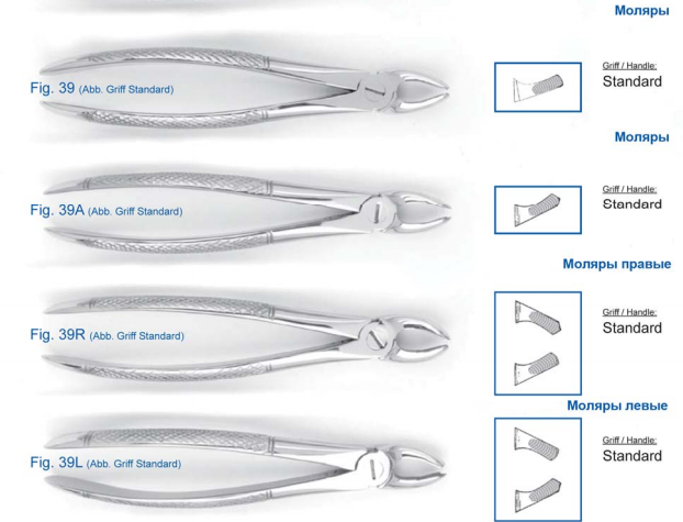 - 11-39 — для удаления моляров на верхней челюсти. Рабочие части инструмента не сходятся. Щечки щипцов закруглены на концах. Щипцы изогнуты S-образно по продольной оси инструмента;