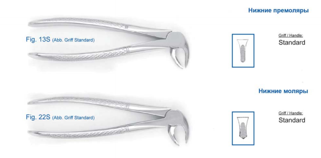 - 11-13S — для удаления премоляров на нижней челюсти. Рабочие части инструмента не сходятся и имеют клювовидную форму, изогнутую по ребру;