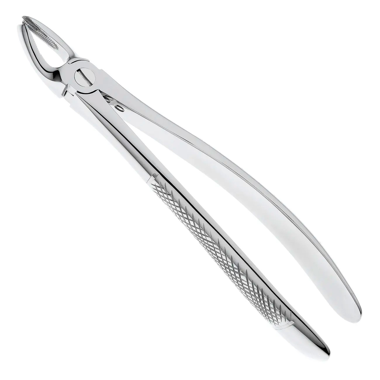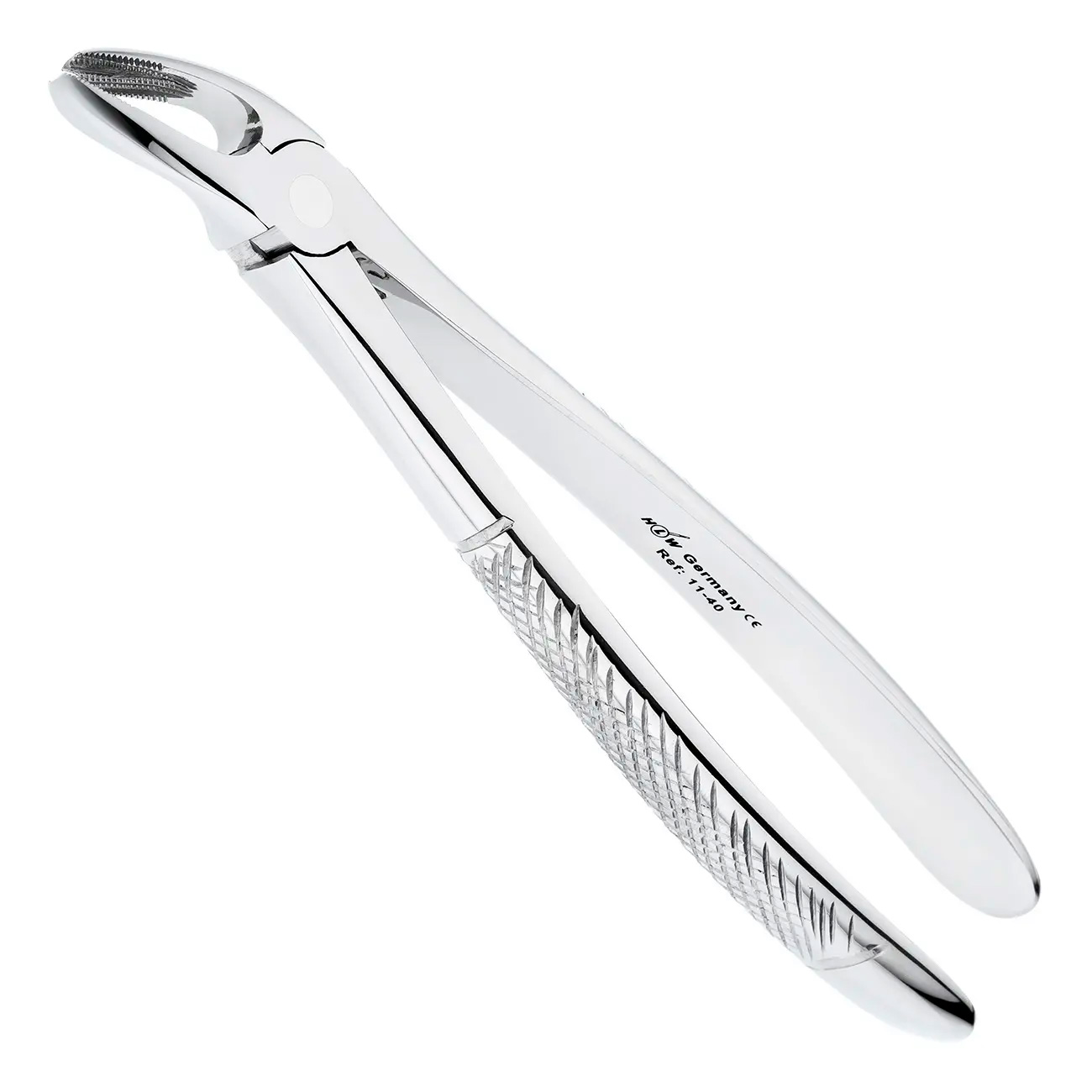 - 11-40 — для удаления молочных и постоянных моляров нижней челюсти с сохранной коронкой. Рабочие поверхности несходящиеся. Инструмент имеет прямоугольной профиль с шипом на конце, который вводится и фиксируется в бифуркации корней. Изгиб рабочей части щипцов удобен при работе с маленькими детьми с небольшой амплитудой открывания рта и небольшими размерами ротовой полости.
