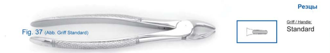 - 11-37 — для удаления резцов на верхней челюсти. Рабочие поверхности щипцов несходящиеся. Обе щечки инструмента одинаковой формы, полукруглые на конце. Рабочая часть прямая;