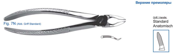 - Артикул 11-7N — рабочие части инструмента не смыкающиеся, с продольно-поперечными насечками на внутренней поверхности щечек и имеют небольшой изгиб, что позволяет добраться до извлекаемого зуба и плотно обхватить его;