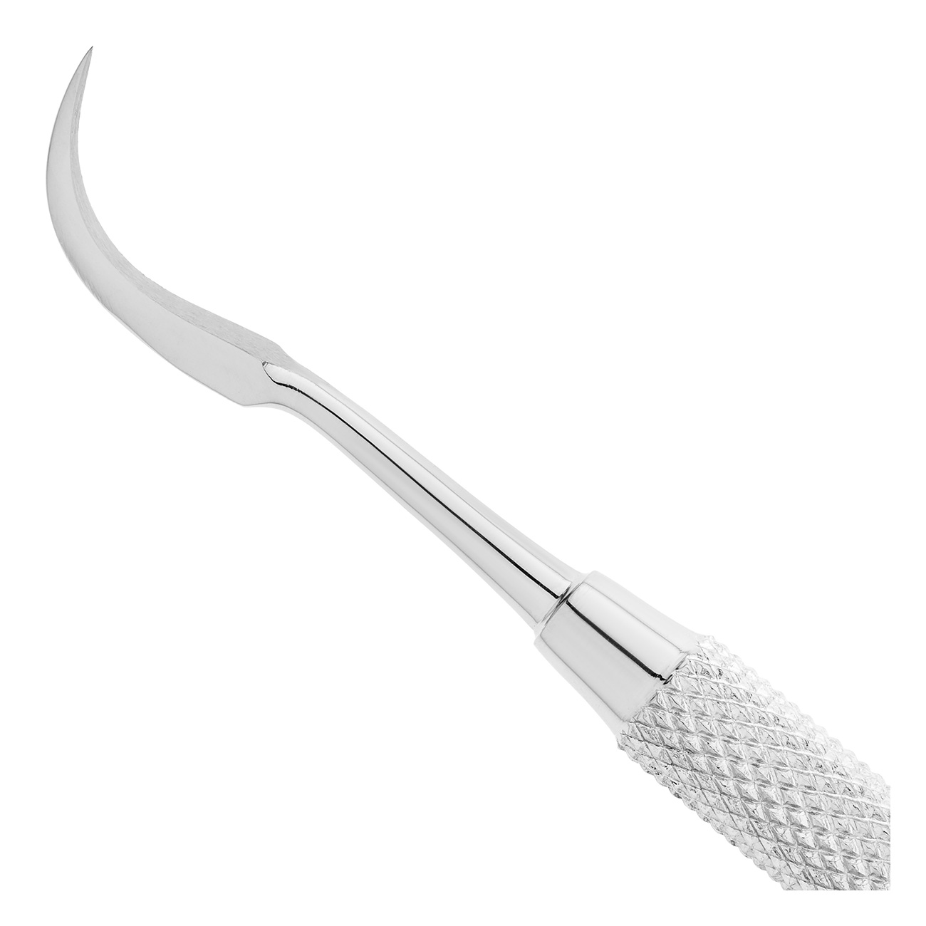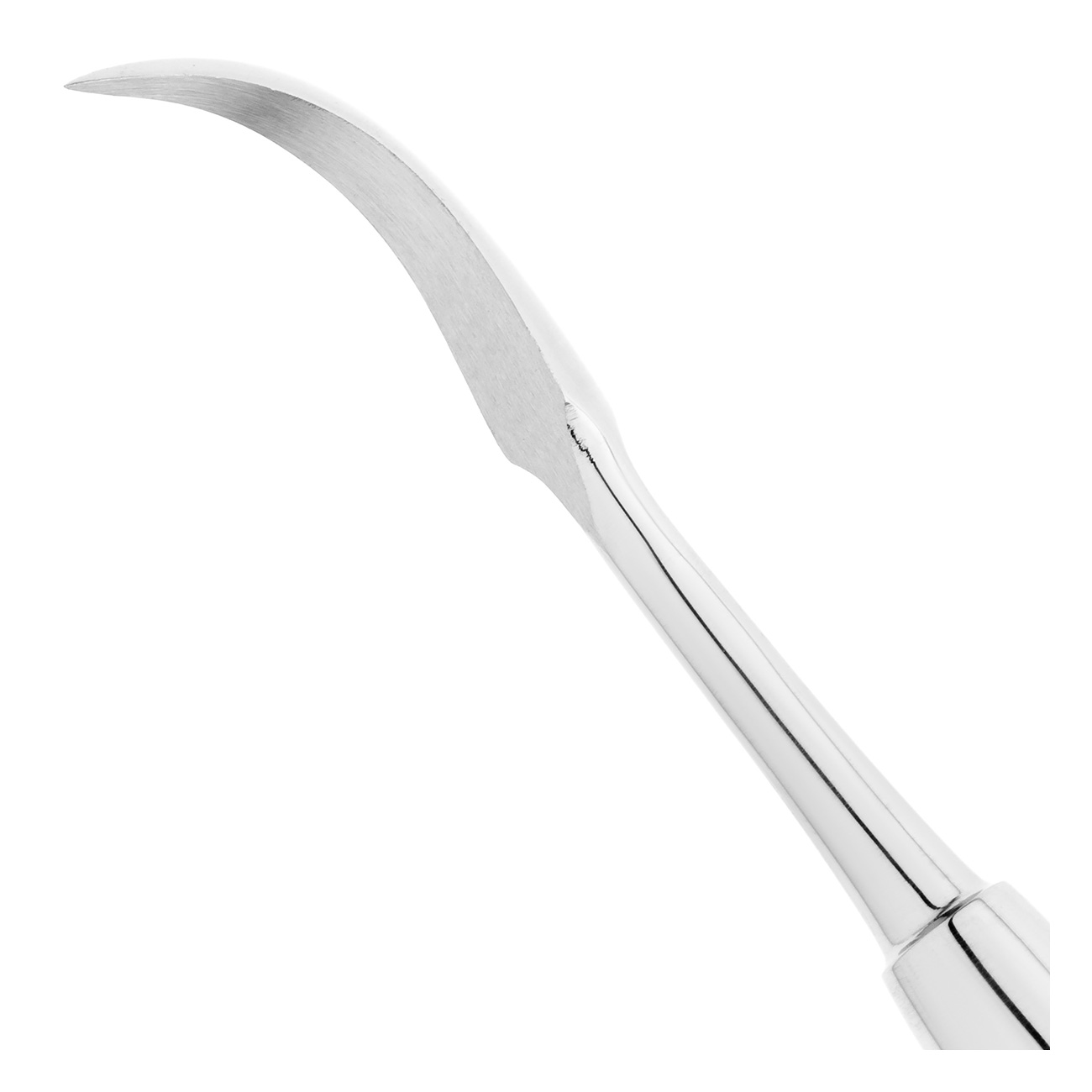 - Имеет одну изогнутую рабочую часть, лицевая поверхность которой имеет копьевидную форму с двумя режущими кромками и острым кончиком.