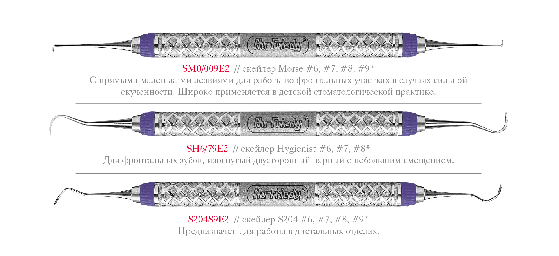 Скейлеры от производителя Hu-Friedy для удаления больших и средних зубных отложений с поверхностей зубов с открытым доступом, а также для удаления наддесневых и поддесневых зубных отложений на глубине 1–2 мм.