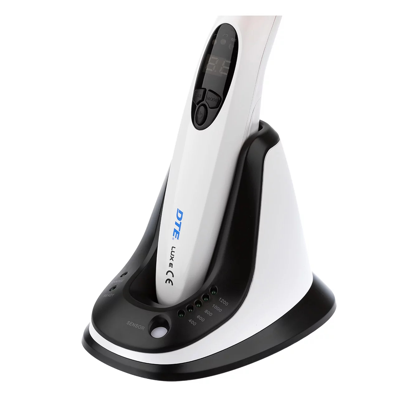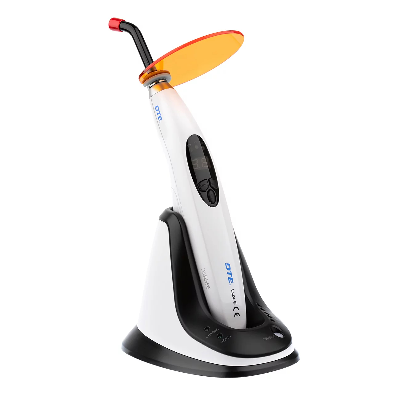 Полимеризационная лампа LUX E DTE от производителя Woodpecker — беспроводная лампа со сменным аккумулятором, увеличенным зарядом батареи и постоянной интенсивностью света. Встроенный фотометр на подставке.