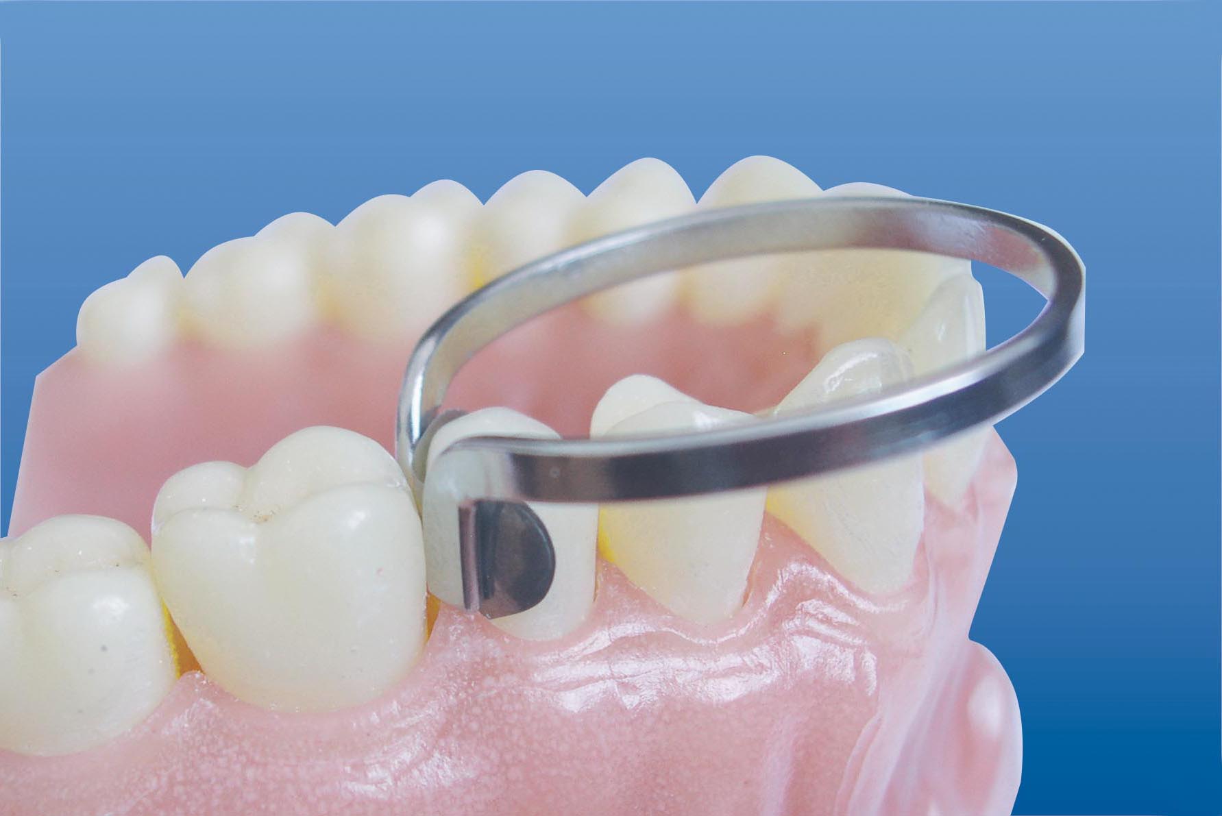 При реставрации полости на дистальной поверхности вогнутые внутрь ножки кольца позволяют направить и удерживать матрицу вдоль боковых поверхностей реставрируемого зуба.