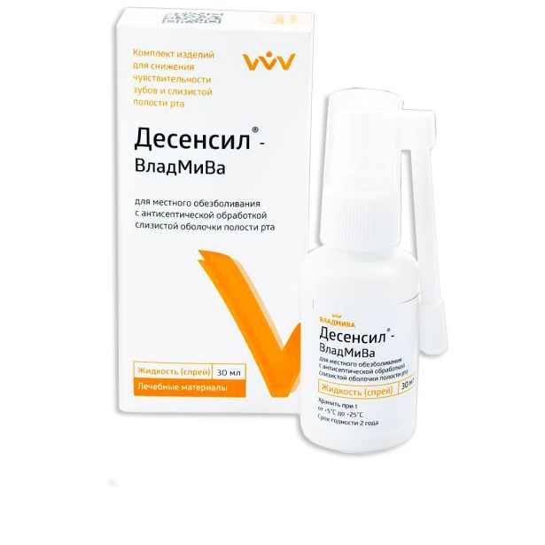 Десенсил-Асепт (30 мл), Владмива — спрей для местной анестезии и антисептической обработки слизистой оболочки полости рта.
