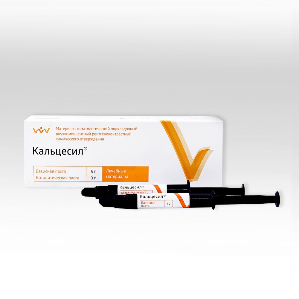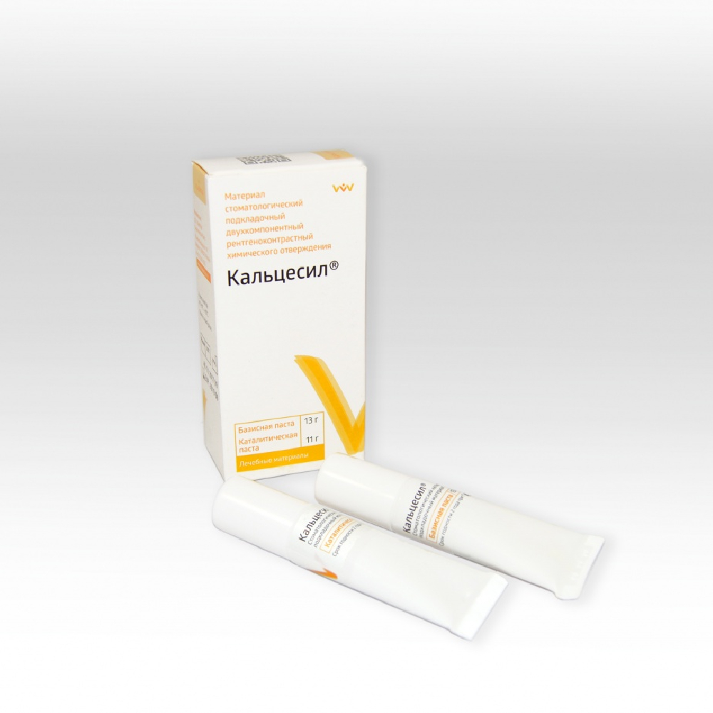Материал «Кальцесил» двухкомпонентный (паста-паста) рентгеноконтрастный кальцийсодержащий подкладочный материал химического отверждения. Обладает высокой клинической эффективностью (стимулирует дентиногенез в процессе и после лечения зуба, восстанавливает пластические функции пульпы).