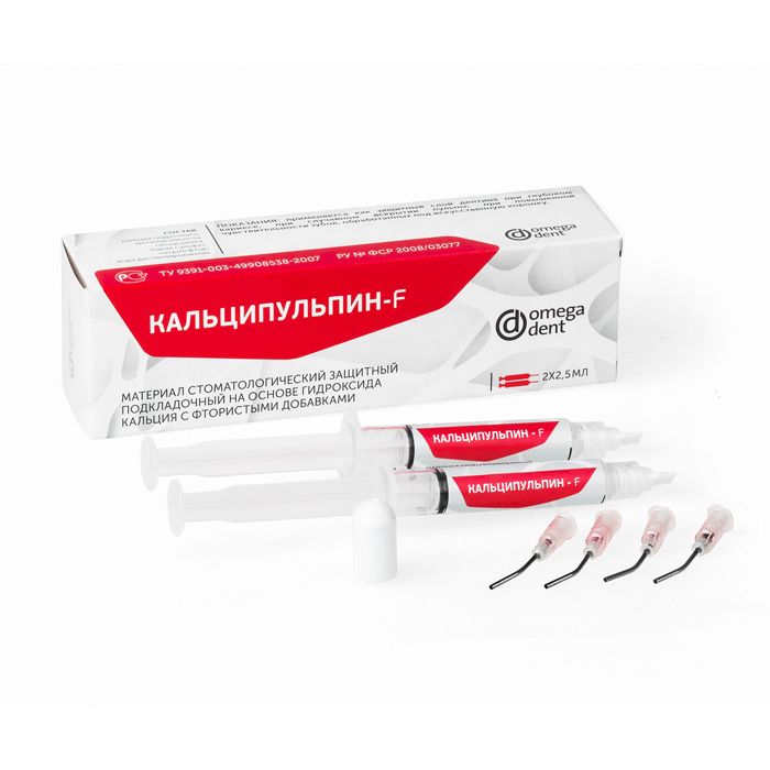Кальципульпин F от производителя Омега-Дент — защитная подкладка на основе гидроксида кальция c добавлением фторида натрия.