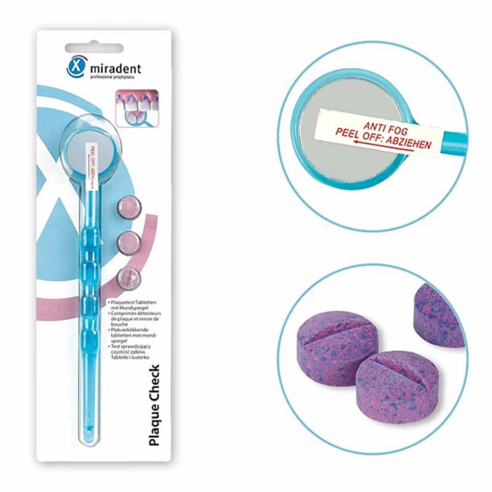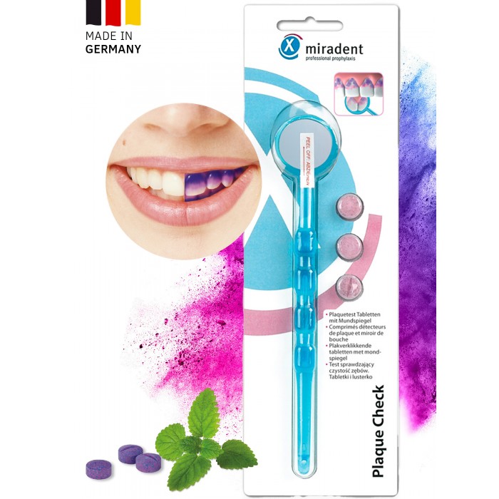 Набор Mira Plaque Check от производителя Miradent — состоит из зеркала и трех таблеток для индикации зубного налета. Комплект идеально подходит для самостоятельного определения, насколько качественно и правильно вы чистите зубы.