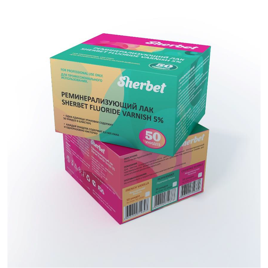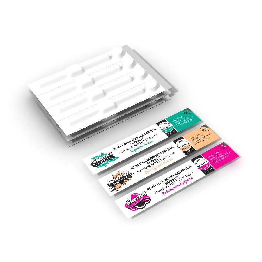 Реминерализующий лак Sherbet Fluoride Varnish 5% от производителя Sherbet — лак на основе смолы с содержанием 5%, фторида натрия. Оказывает сильноедействие, снимающее повышенную чувствительность при нанесении на поверхности эмали и дентина зуба. После нанесения на зубах остается тонкая пленка.