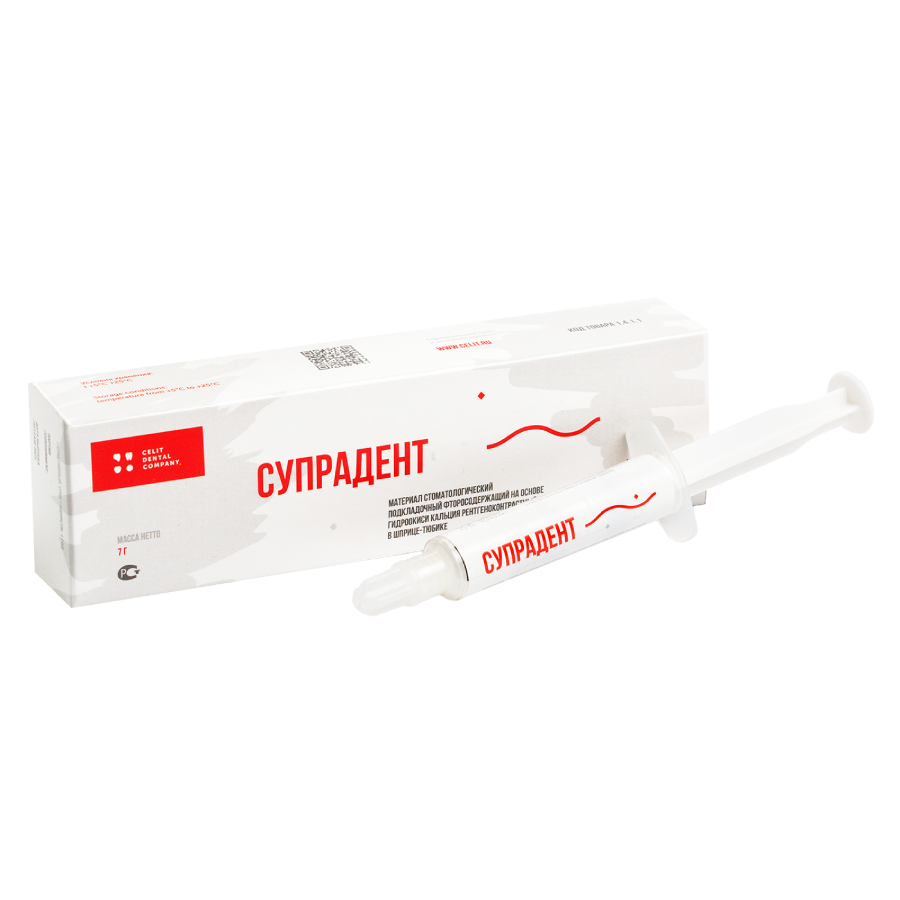 Супрадент от производителя Целит — материал стоматологический, подкладочный, фторсодержащий, на основе гидроокиси кальция.