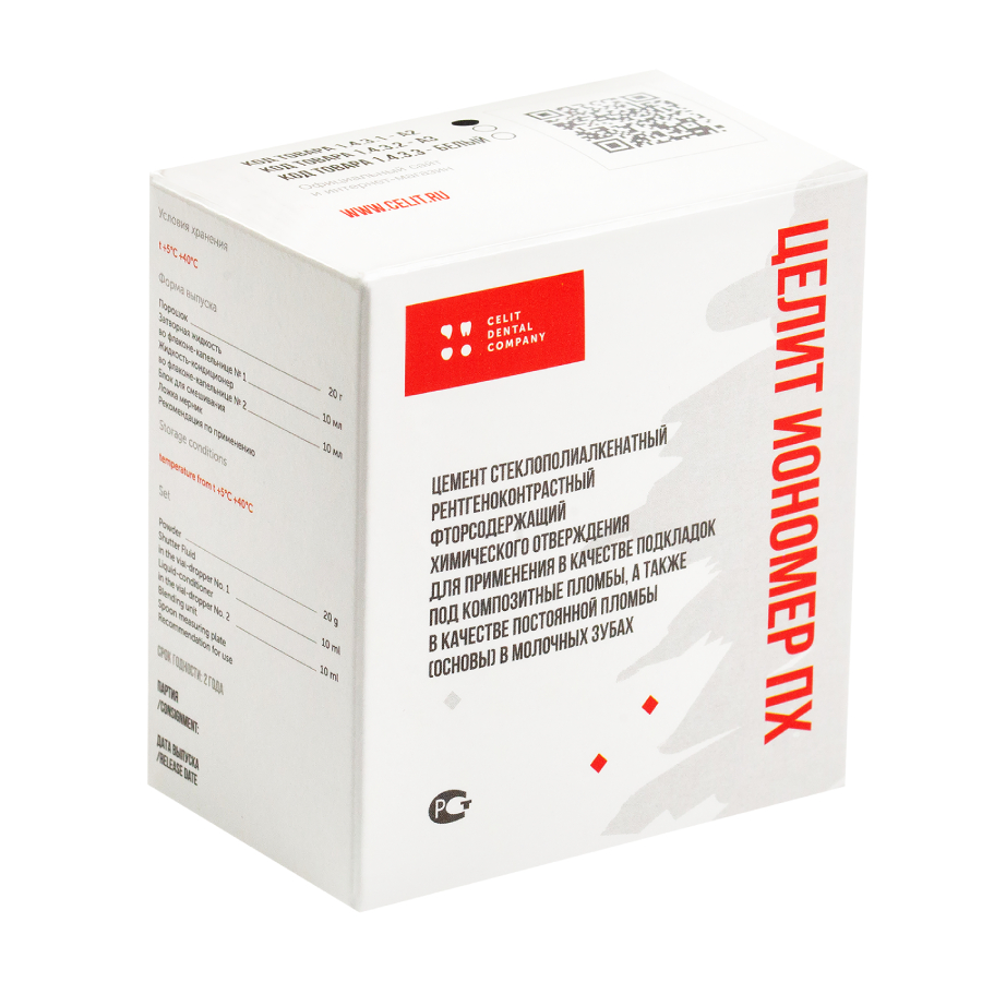 «Целит Иономер ПХ» выпускается в виде комплекта порошок-жидкость. Порошок представляет собой тонкодисперсное кальций-стронций-алюмофторсиликатное стекло. Жидкость - модифицированный раствор полиакриловой кислоты.