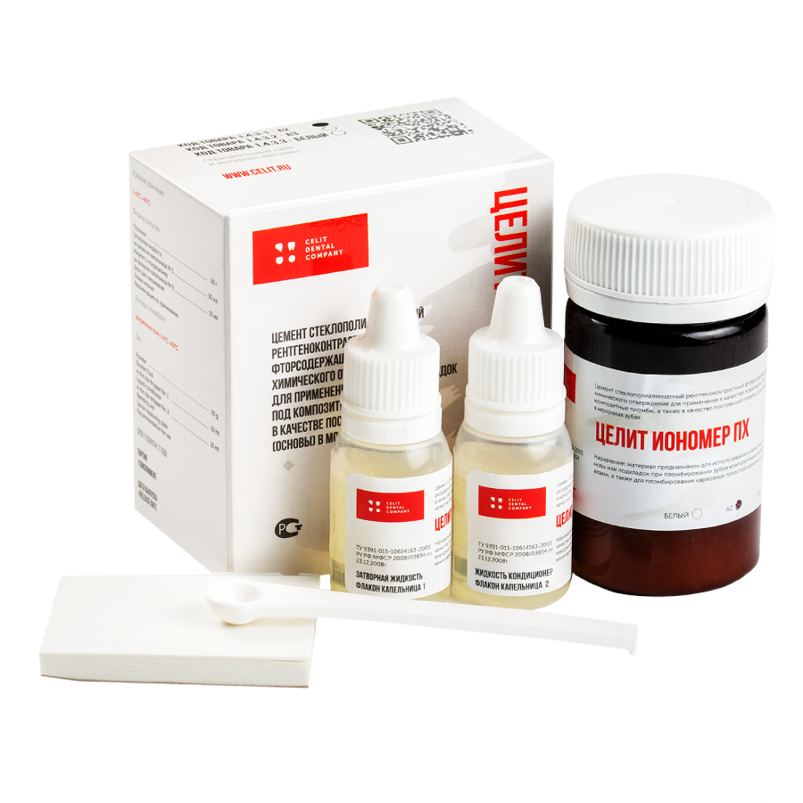 Целит Иономер ПХ от производителя Целит — цемент стеклополиалкенатный, рентгеноконтрастный, фторсодержащий, химического отверждения.