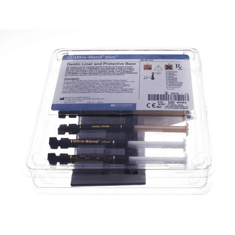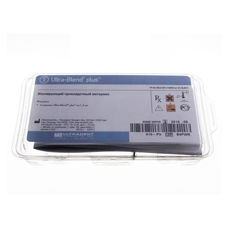 UltraBlend plus от производителя Ultradent — уникальный, светоотверждаемый, рентгеноконтрастный прокладочный материал, содержащий гидроксид кальция и гидроксиапатит на основе уретан диметакрилатных смол.