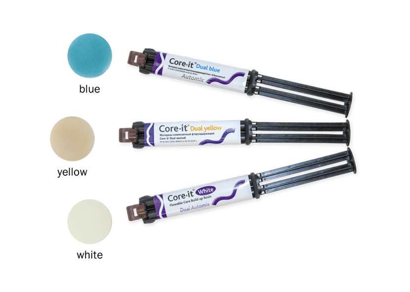 - Core it Dual System Kit (10г х 2 шприца, 12 смешивающих насадок, 5мл гель для протравки FineEtch, Esbond 5мл, Activator Esbond 5мл, пластиковая палетка с защитой от света, кисточки с держателем 30шт, смешивающие насадки);