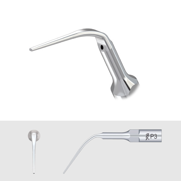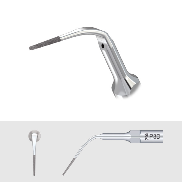 - Насадка P3D — насадка "Perio" для очистки и промывания глубоких десневых карманов. Насадка с алмазным покрытием (40 мкм) для прикорневой очистки зубов после периодонтальной лоскутной хирургии. Также используется для формирования краев коронки и для расширения фуркации зубов.