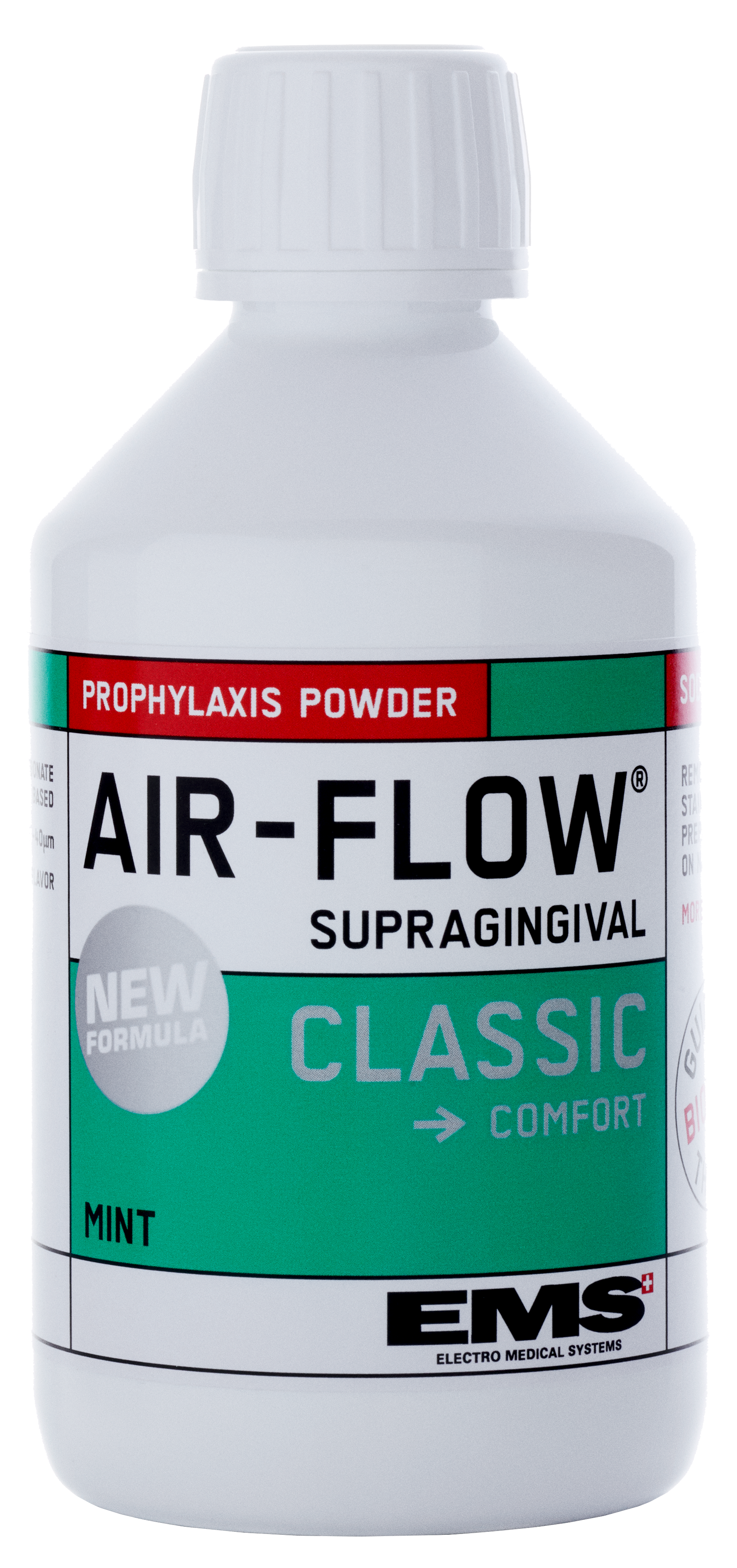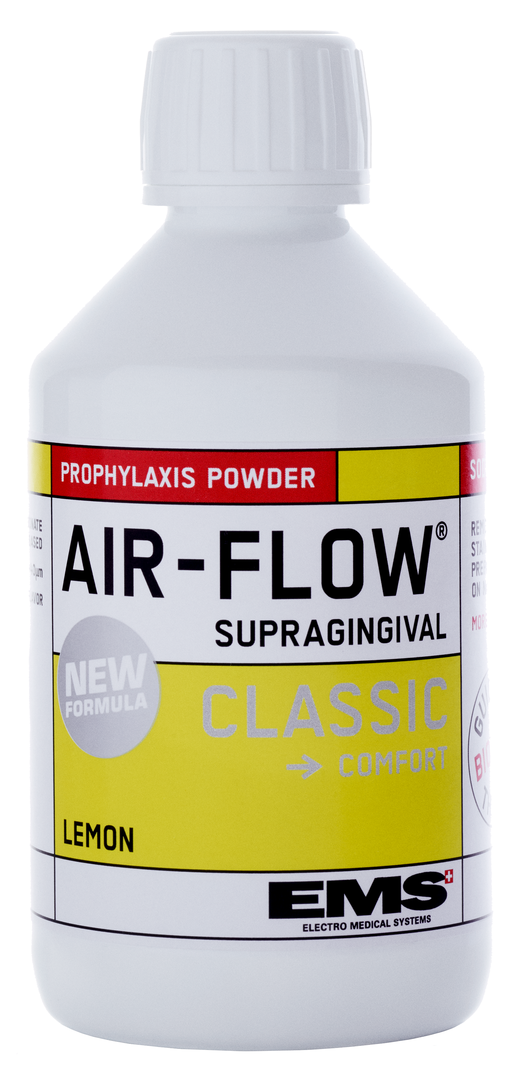 Air-Flow Classic Comfort со вкусом лимона от производителя EMS — усовершенствованная версия классического порошка для пескоструйной обработки. Уменьшенный размер гранул повышает комфорт процедуры без потери очищающей способности.