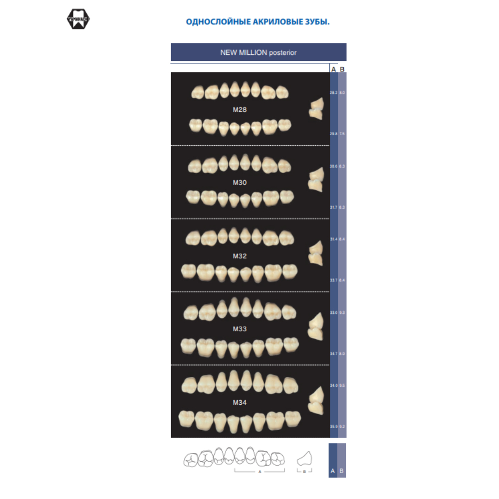 Зубы серии New Million — боковые однослойные акриловые зубы, угол жевательных бугорков зубов составляет 33 градуса.